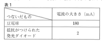 豆電球または発光ダイオードを電源装置につなぎ, 2.0Vの電圧を加えたとき、それぞれ点灯するこ ことを確かめ、そのとき流れる電流の大きさをはかり,表1にまとめた。
