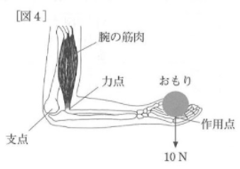 1 [図4]で,作用点はおもりを支える手の ひらにあり,力点は腕の筋肉が骨についているところであり,支点はひじの関節である。支点,力点,作用点が一直線上にあり,腕 の筋肉が縮む力の大きさは60N,支点から作用点までの距離が30cmであったとき, 支点から力点までの距離は何cm か。ただし, 支点から先の腕の重さは考えないものとする。
