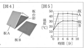 6 [図4] のように,板Aには、板の面に太陽光が垂直にあたるよう調節し,板Bは,水平な位置に置いた。 7 赤外線放射温度計を用いて,2分おきに 10分間,板A 板A,Bの表面温度をはかった。