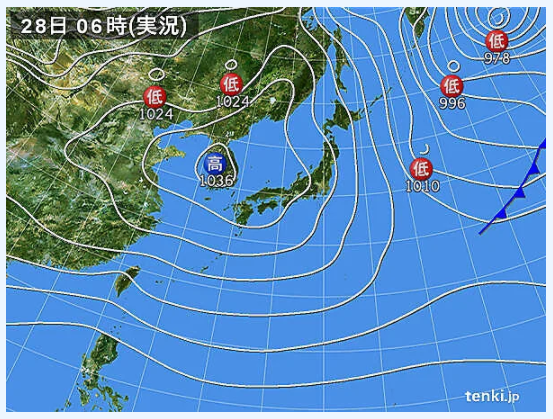 高気圧が日本の上空に張り出し、昨日までの西高東低の冬型の気圧配置から暖かさを感じる一日になりそうですが、等圧線の間隔が狭いので強風で大変になりそう。